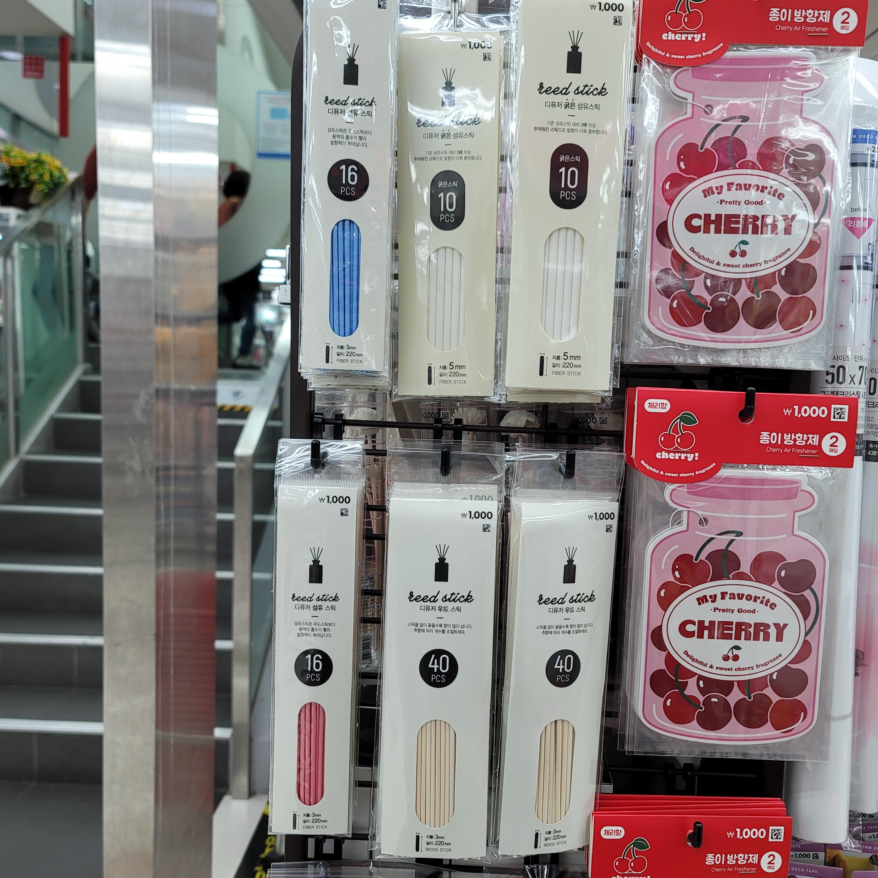 디퓨저 스틱은 다이소에서 구매했습니다. 제가 갔던 지점에서는 우드스틱, 섬유스틱(흰색/하늘색/분홍색) 이렇게 있었는데, 우측상단에 있는 흰색 굵은 스틱이 발향이 더욱 풍부하다고 해서 한번 저걸로 사봤어요 ㅎㅎ
