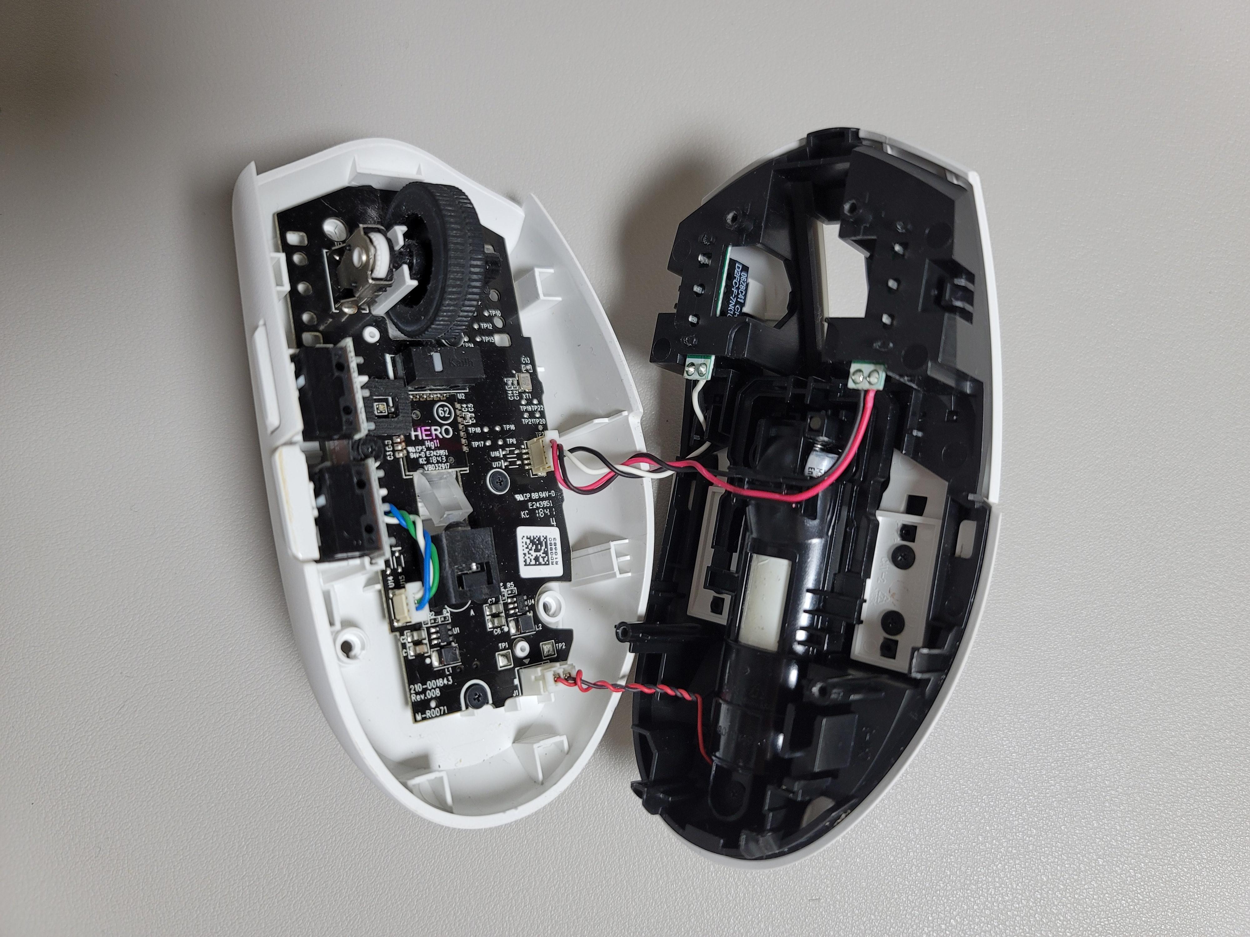 나사를 다 풀면 마우스 상부와 하부를 분리할 수 있는데, 사진처럼 처음에는 커넥터 2개가 상하로 연결되어 있습니다. 그래서 전선이 끊어지지 않도록 처음엔 천천히 분해해야 하고, 커넥터 2개를 뺀 뒤에야 완전히 분리가 가능합니다. 저는 더블클릭 현상이 있는 좌/우 클릭 스위치를 교체해야하니, 상부를 마저 분해해보겠습니다.