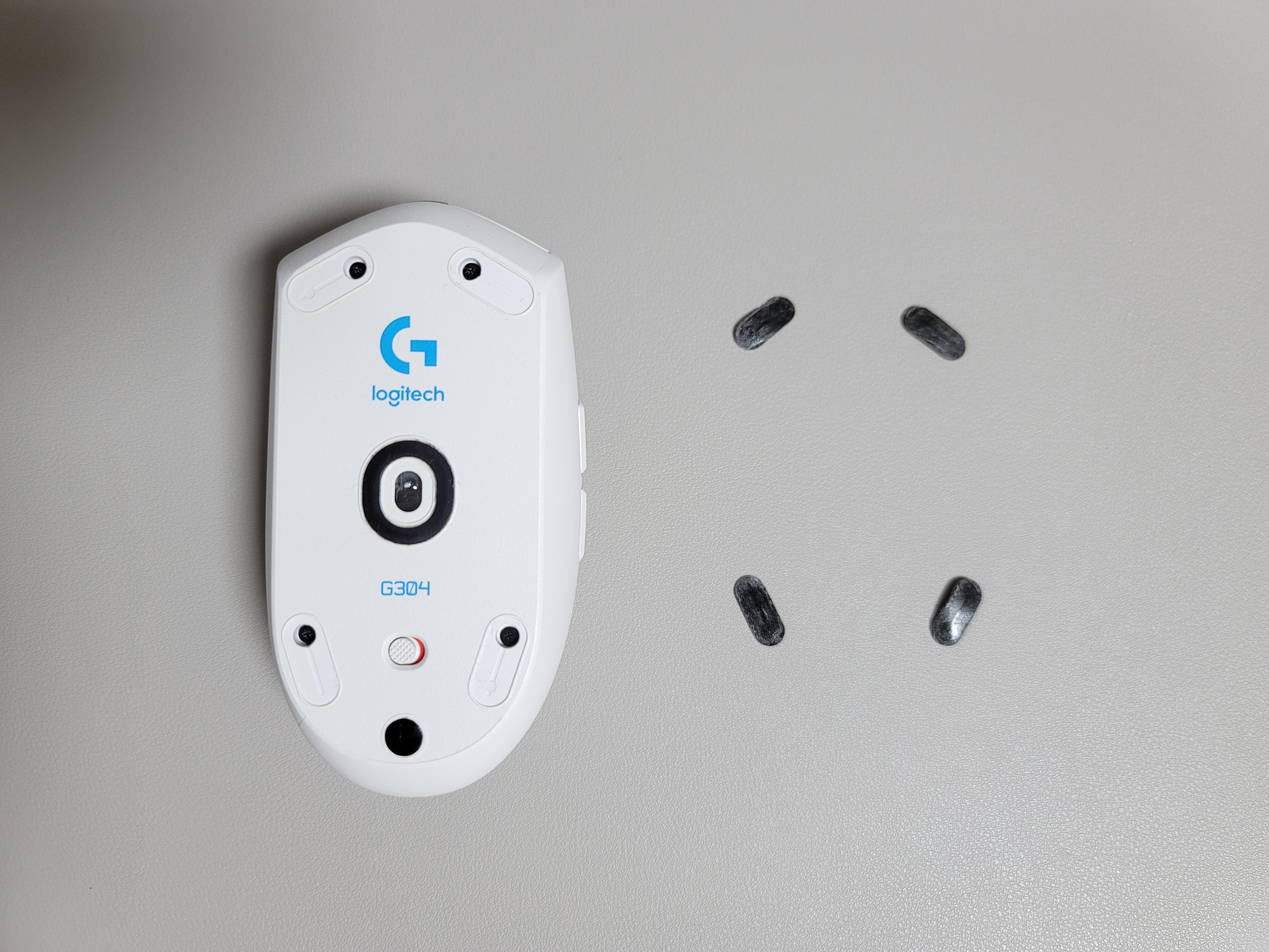 마우스를 분해하기 위해, 먼저 바닥에 있는 검은색 피트를 제거하고 나사를 풀어야합니다. 피트를 떼기 전 열을 충분히 가해준 뒤 천천히 떼어내면 좀 더 깔끔하게 분리되어 재사용도 가능합니다. 혹시나 재활용이 불가능할 정도로 피트가 망가진다해도, 온라인으로 쉽게 구매가 가능하니 크게 걱정 안하셔도 됩니다. G304의 경우 위와같이 피트 4개만 떼어내면 분해가 가능합니다. 아래 동그란 피트 뒤에는 나사가 없었습니다.