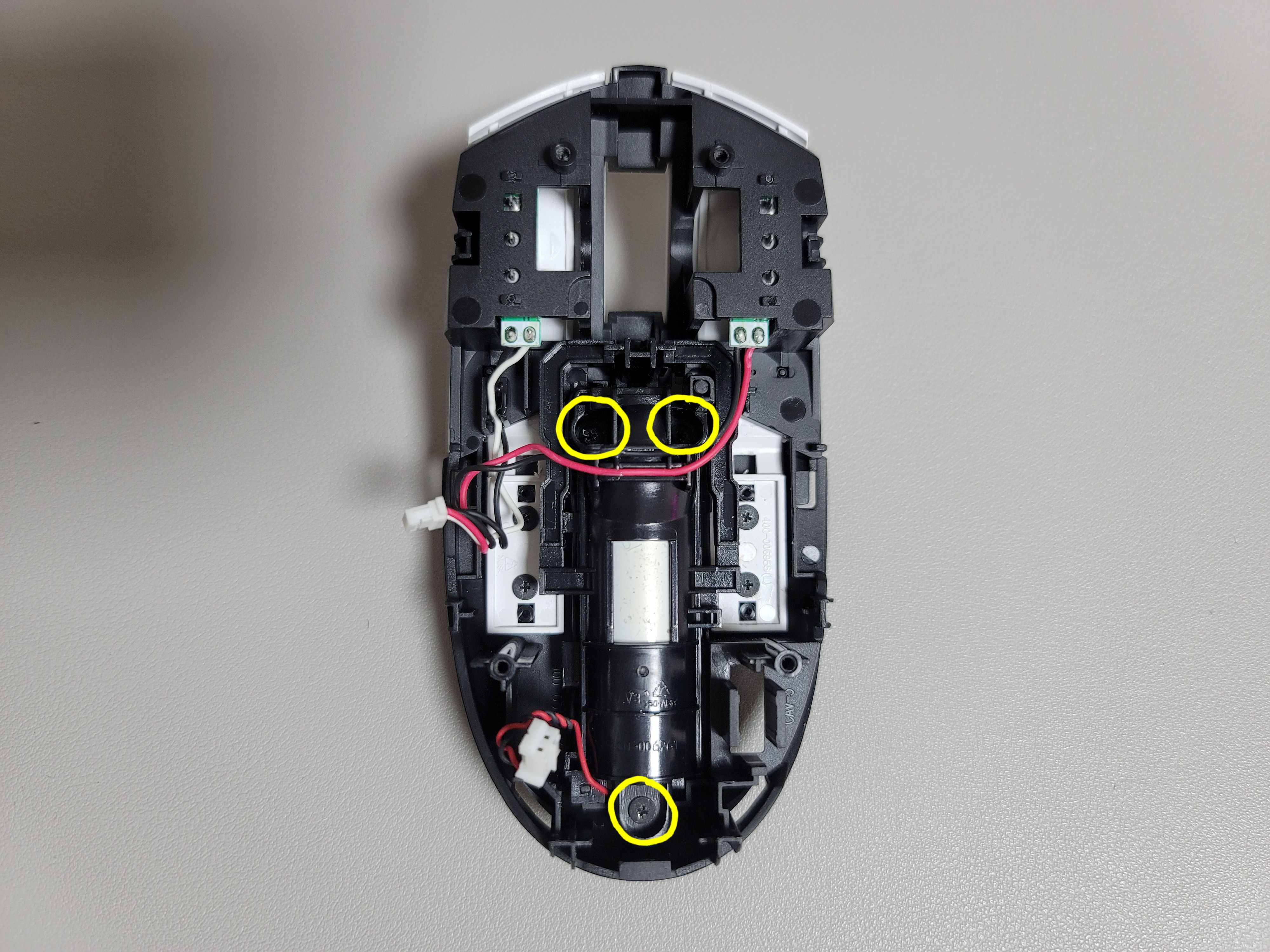 사진에서는 생략했는데, 마우스 상부에서 건전지 뚜껑과 건전지를 빼낸 상태입니다. 좌/우클릭 스위치가 있는 PCB를 좀더 쉽게 떼내려면 중앙에 있는 건전지 집을 떼내는게 좋은데, 사진에 표시되어있는 나사 3개를 풀면 분해할 수 있습니다. 이 과정을 생략하고 좌/우 클릭 버튼을 분해하려면 좀 많이 힘듭니다ㅎㅎ