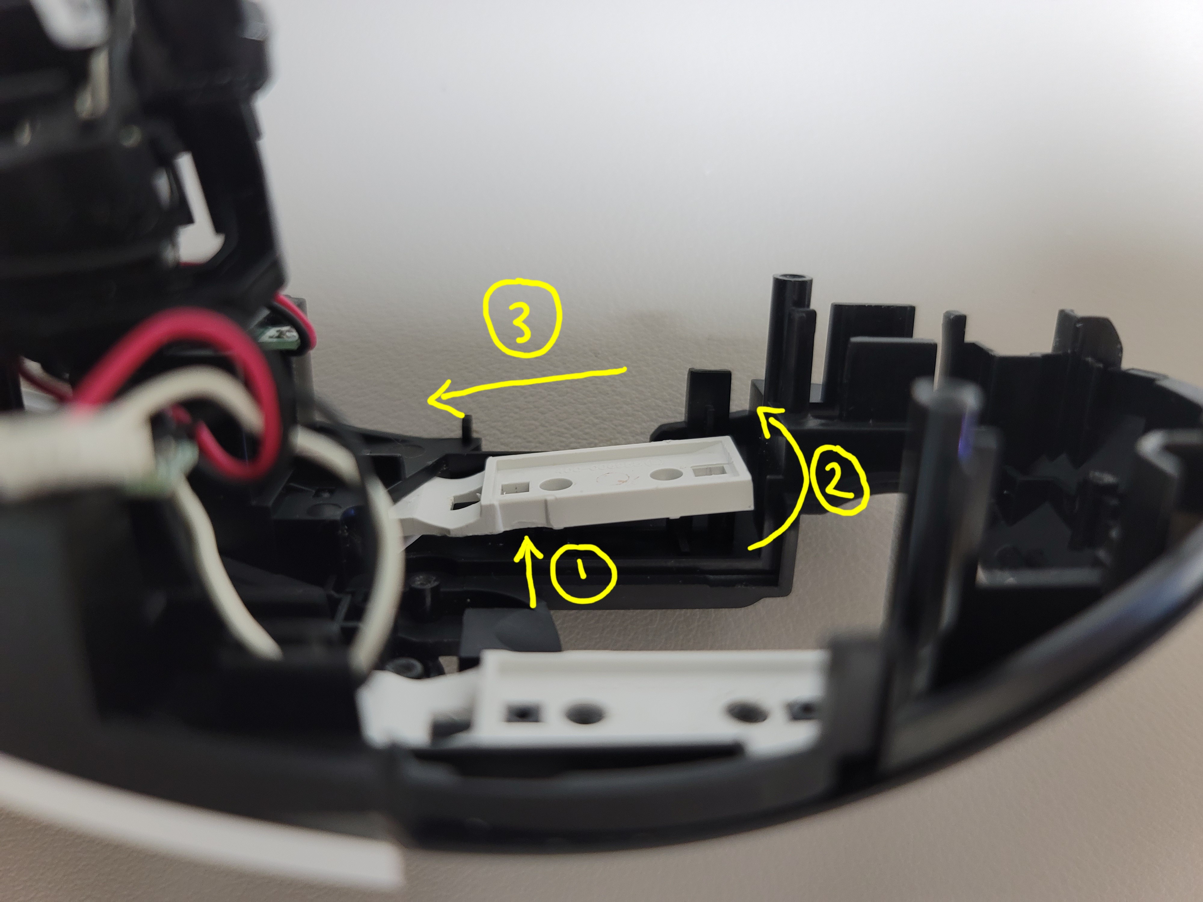 좌/우클릭 버튼을 뺄 떄는 위 사진처럼 (1) 버튼 아래를 핀셋처럼 얇은 걸로 찔러넣어 (2) 반시계 방향으로 들어올린 다음에, (3) 마우스 위쪽 방향으로 당겨주시면 분해가 가능합니다. 부품이 얇아서 자칫 부러질 수도 있으니 주의하시기 바랍니다.