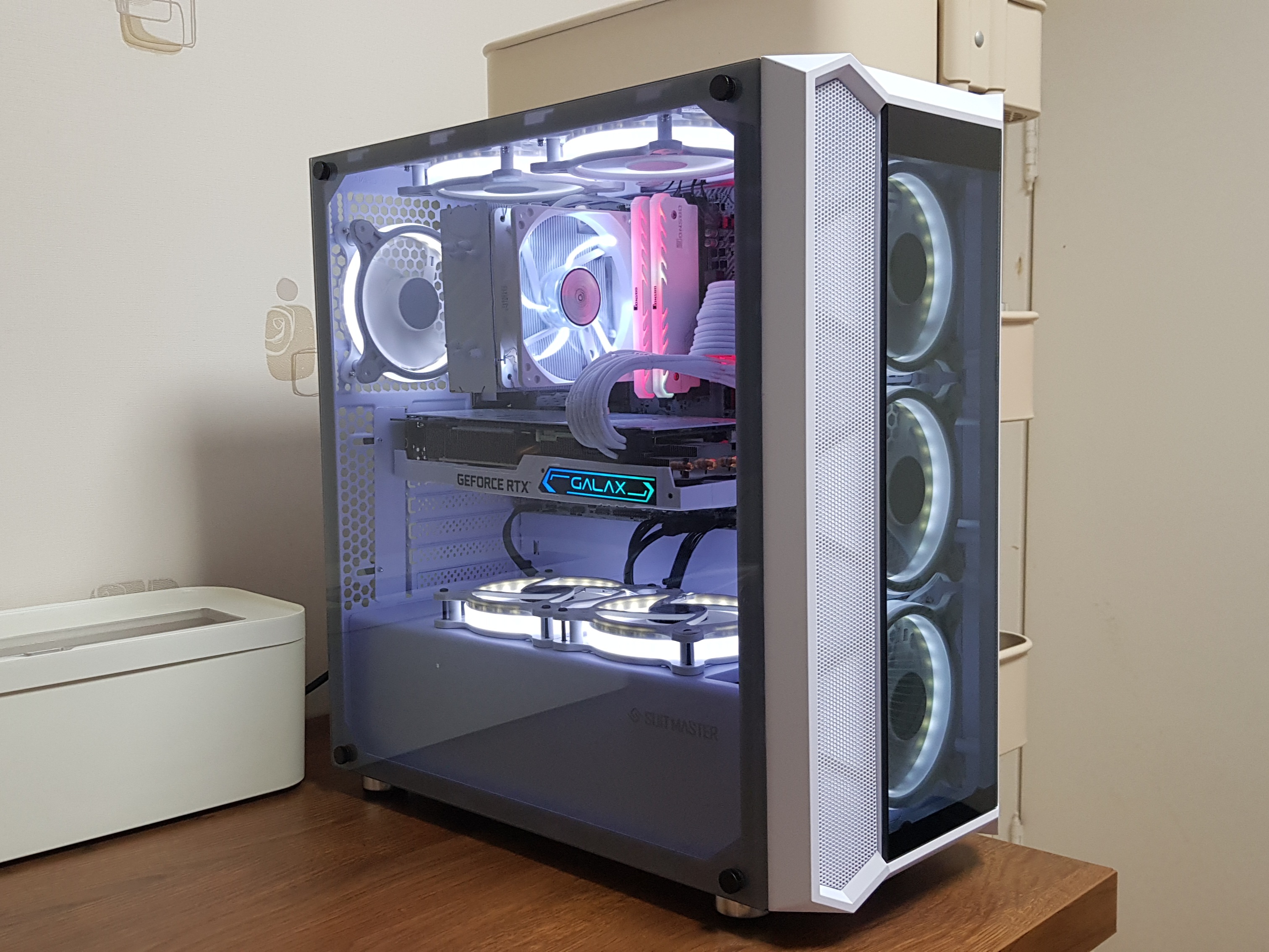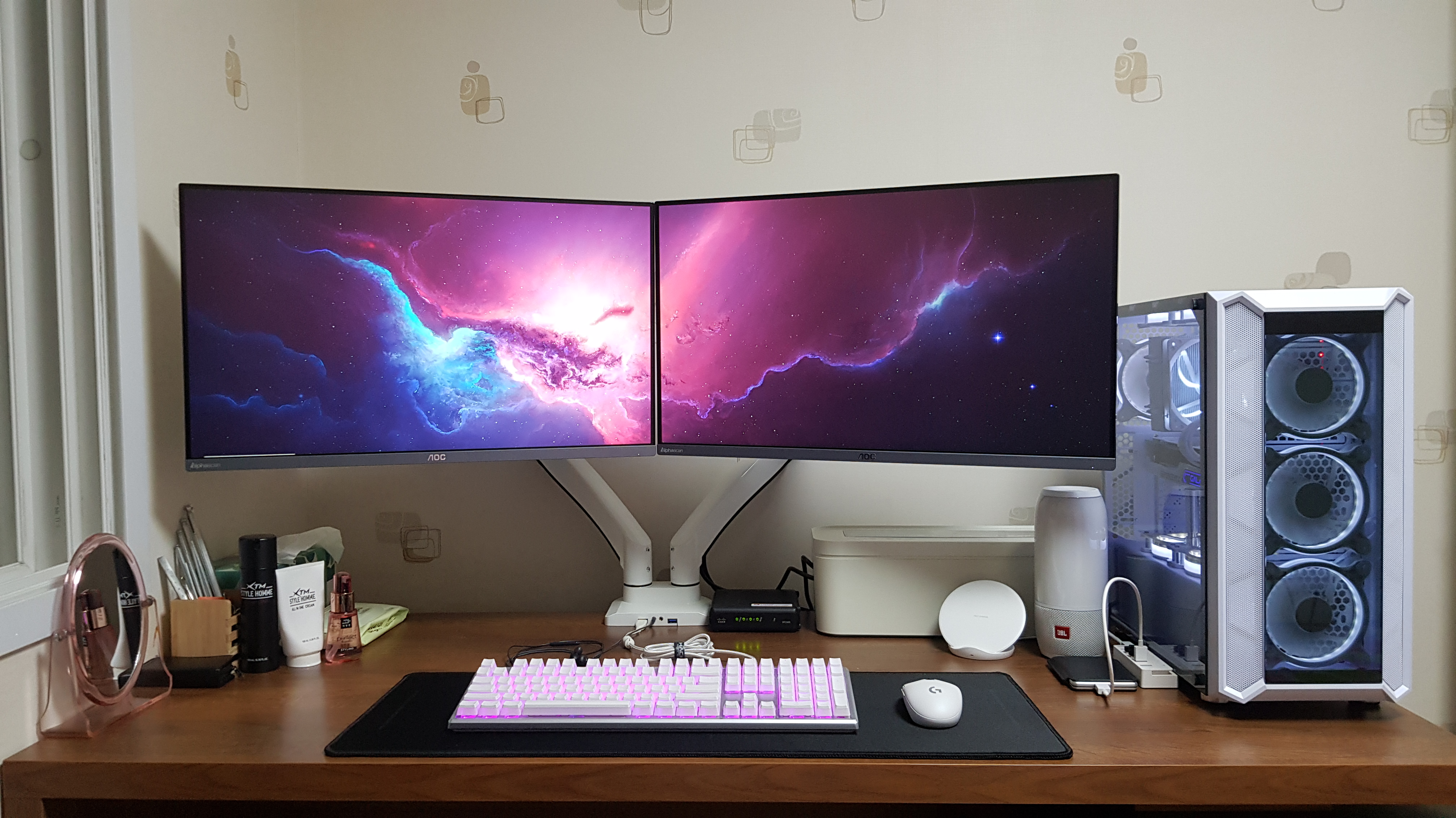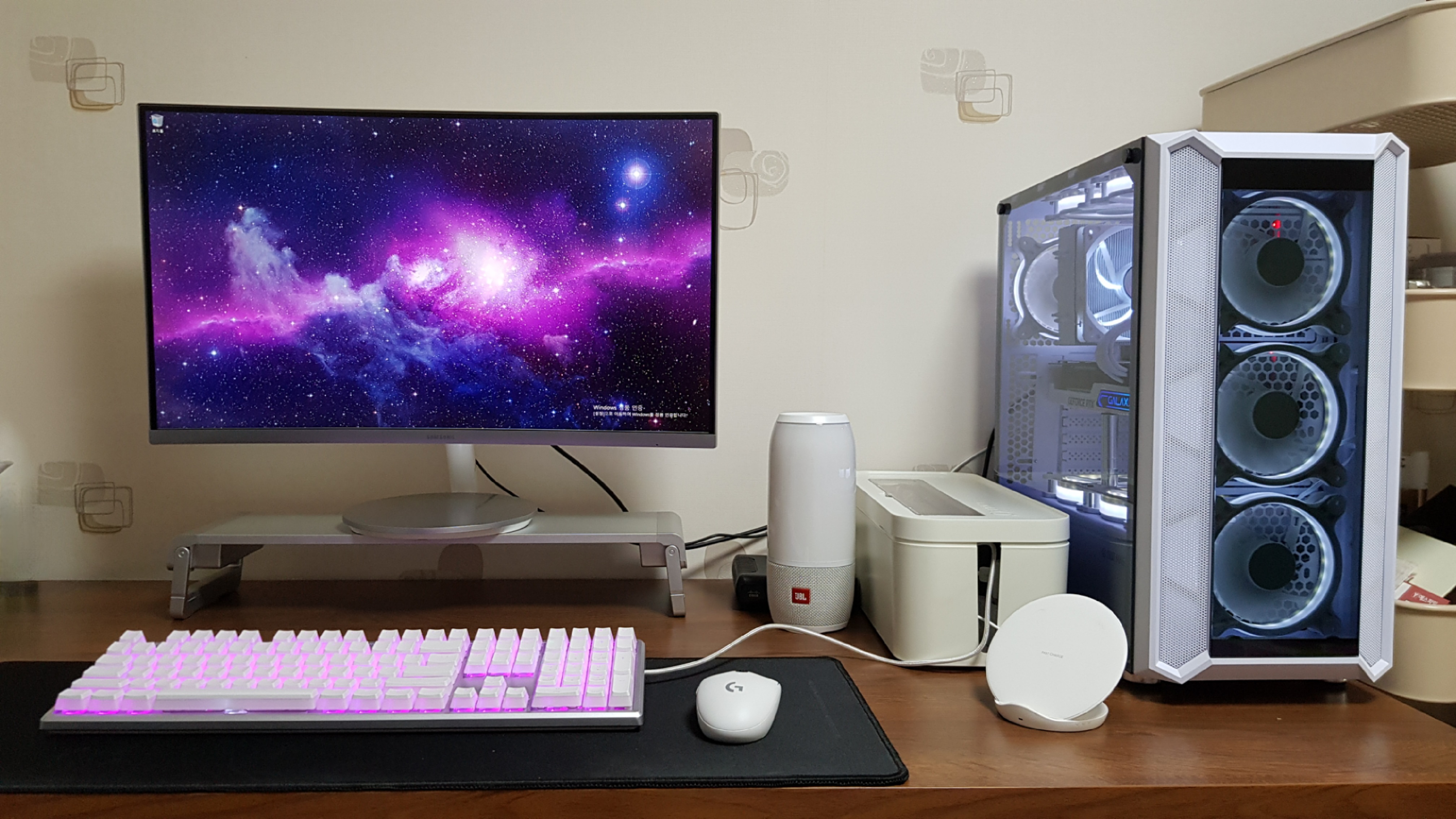 대학졸업, 본가 복귀 및 취업 후의 데스크 셋업입니다. 원래는 대학교 졸업 후에도 모니터+노트북 조합으로 사용하고 있었는데, 어느 날 문득 뜬금없이 데스크탑을 맞추고 싶다는 생각이 들어 큰맘먹고 질렀습니다. 본체 안에 안보이는 곳까지 전부 화이트로 맞췄는데 언제봐도 굉장히 만족스럽습니다.